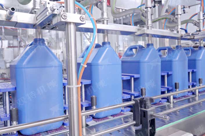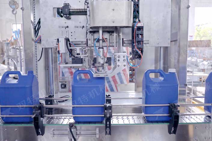 雙特機(jī)械稱重式灌裝生產(chǎn)線適用于5-200L的稱重計量灌裝,自動完成計數(shù)進(jìn)桶、稱重計量灌裝、自動理蓋、跟蹤式旋蓋機(jī)、自動貼標(biāo)機(jī)、噴碼機(jī)、自動供棧機(jī)、碼垛機(jī)、自動纏膜 等全流程生產(chǎn)。